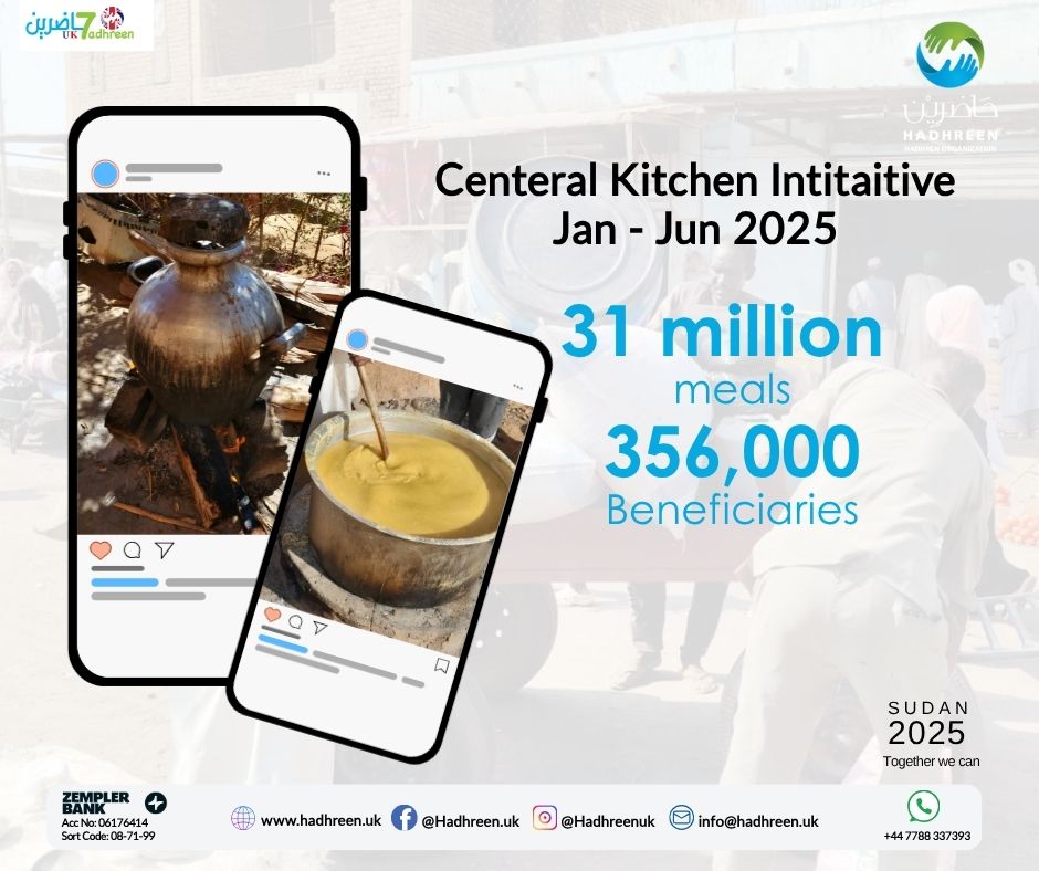 Hadhreen Sudan’s Central Kitchen Programme remains one of the most expansive humanitarian food response efforts in the country. In the first half of 2025, with steadfast support from our international partners and donors, over 31 million hot meals were distributed to more than 356,600 individuals across four conflict-affected states. Operations were sustained in Khartoum, Jabal Awliya, and East Nile, and later expanded to all four states during Ramadan, thanks to Zakat al-Fitr contributions and targeted grants. Special attention was also given to kitchens dedicated to child-focused nutrition, ensuring daily meals rich in essential nutrients. We extend our sincere gratitude to Hadhreen UK donors, whose continued generosity plays a pivotal role in keeping our kitchens operational and our communities nourished. #Together_we_can